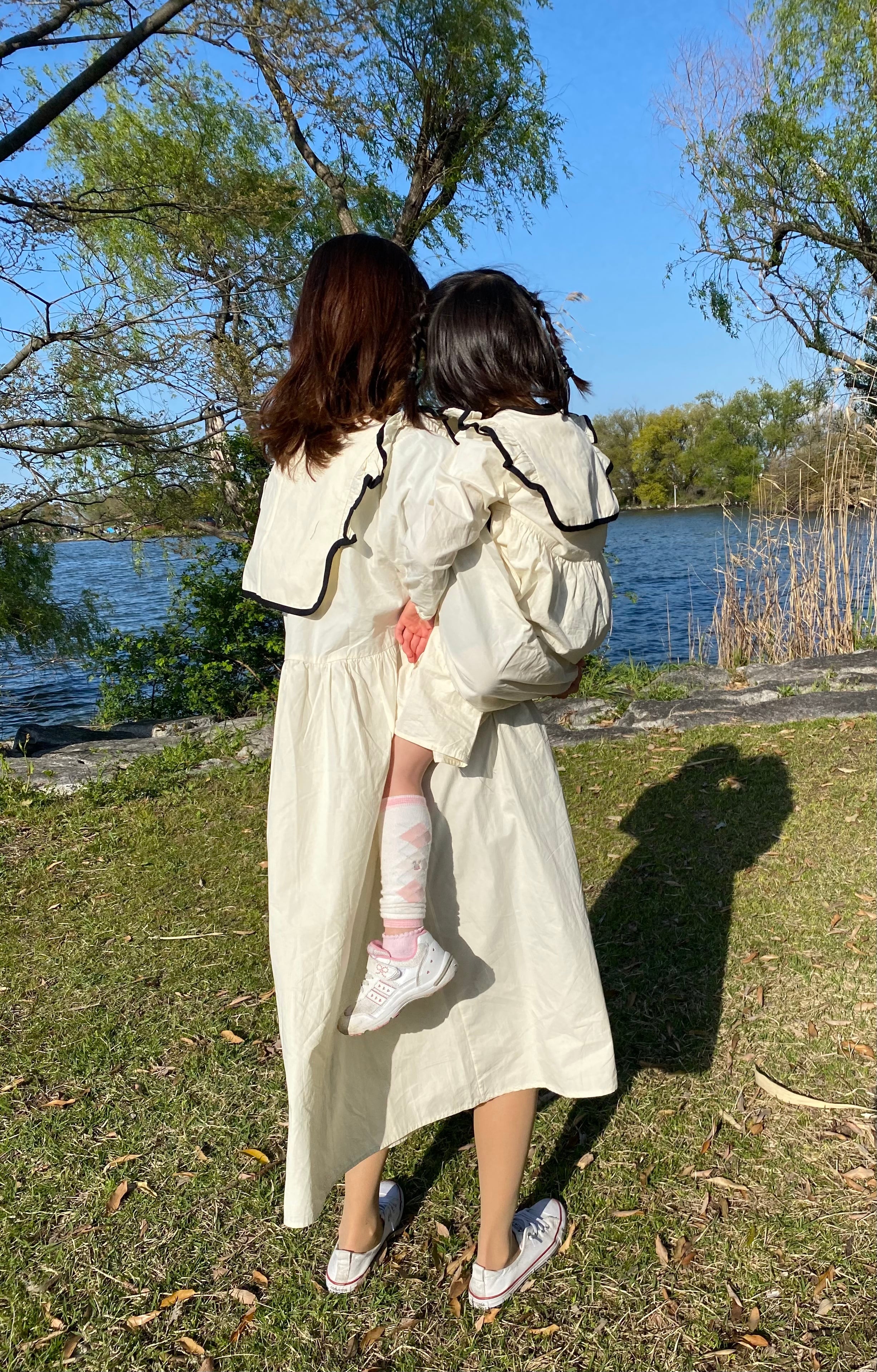 今年のトレンドの大襟、ピーターパン襟、セーラー襟付きの膝下ワンピースです。