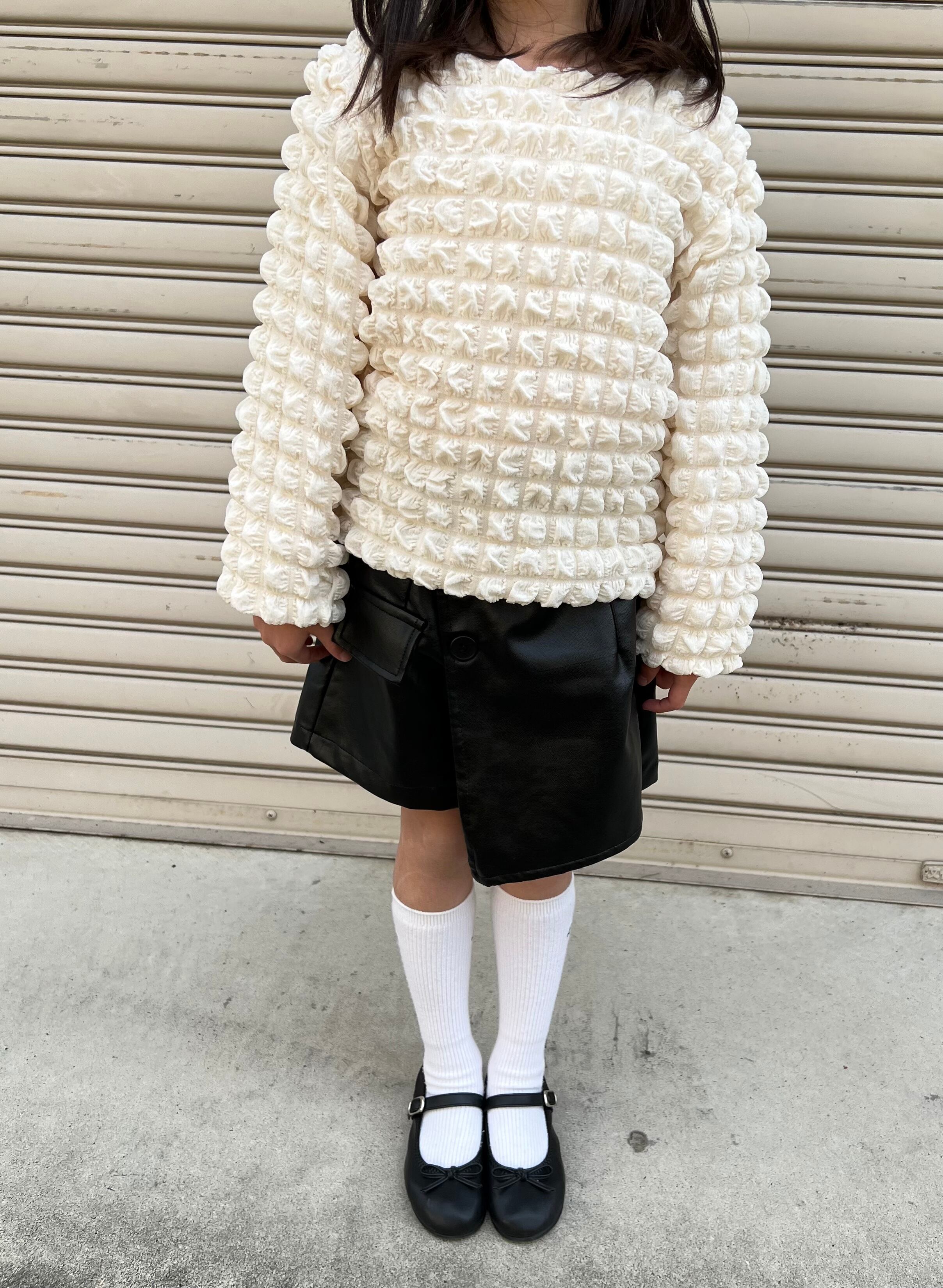 ポコポコとしたワッフルのような立体的な生地感のトップスとエコレザーのショートパンツの2点セットです。(大人用はトップスのみの販売となります。)